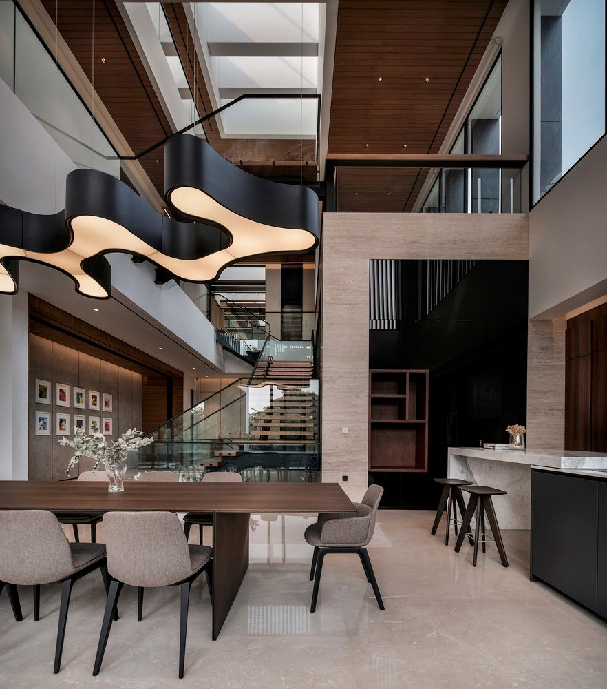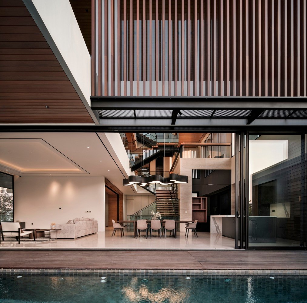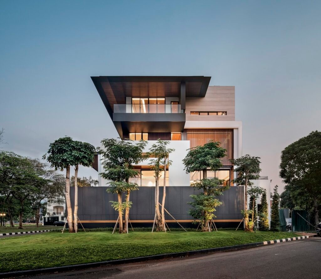 Nằm giữa lòng khu đô thị sầm uất, ngôi nhà đa tầng này nổi bật với phong cách thiết kế đương đại, đồng thời mang đến trải nghiệm sống yên bình và thanh lịch. Kiệt Tác Thiết Kế Kiến Trúc Biệt Thự Hiện Đại nổi bật với mặt tiền hình học sắc nét, phản chiếu ánh sáng và bóng râm đầy nghệ thuật. Việc sử dụng vật liệu tự nhiên như gỗ và đá làm điểm nhấn, tạo nên cảm giác ấm áp cho thiết kế tối giản.